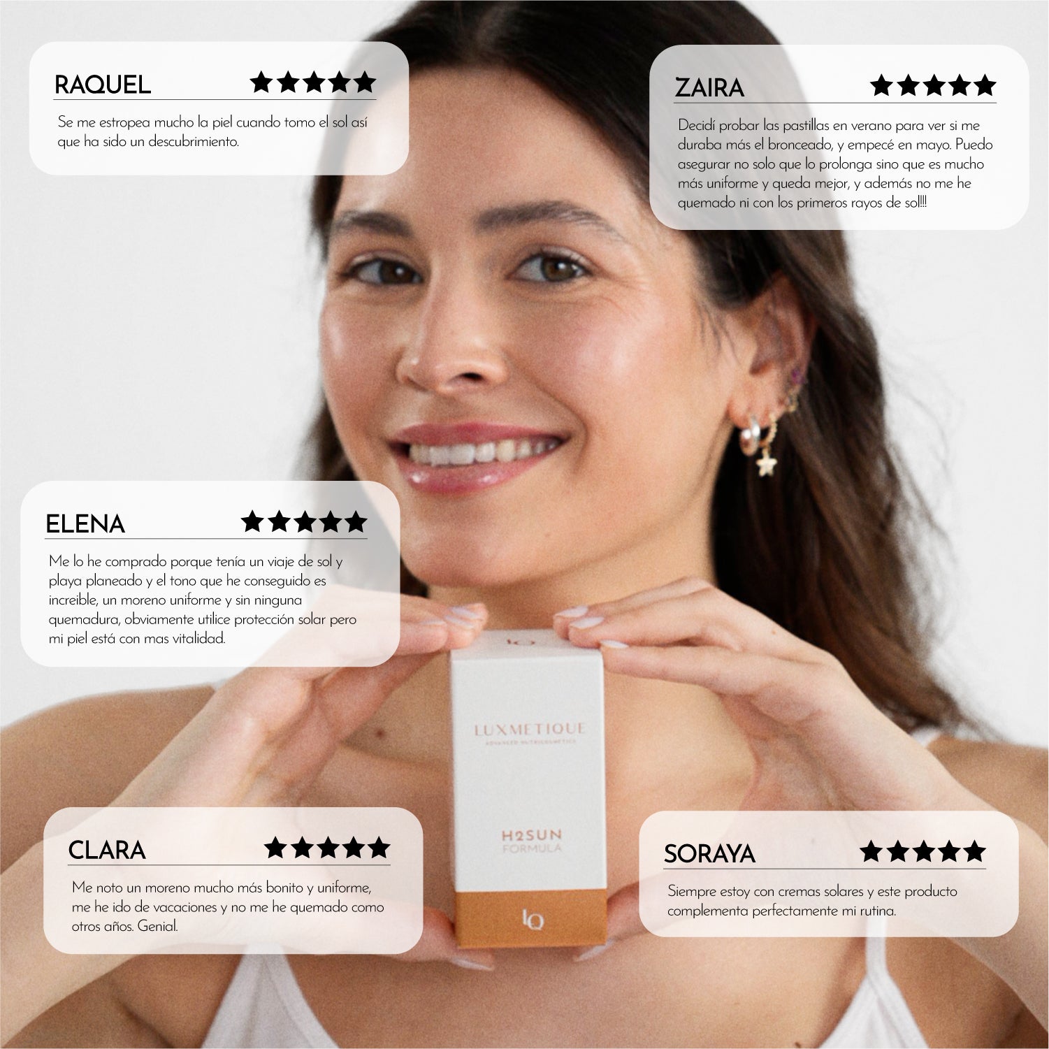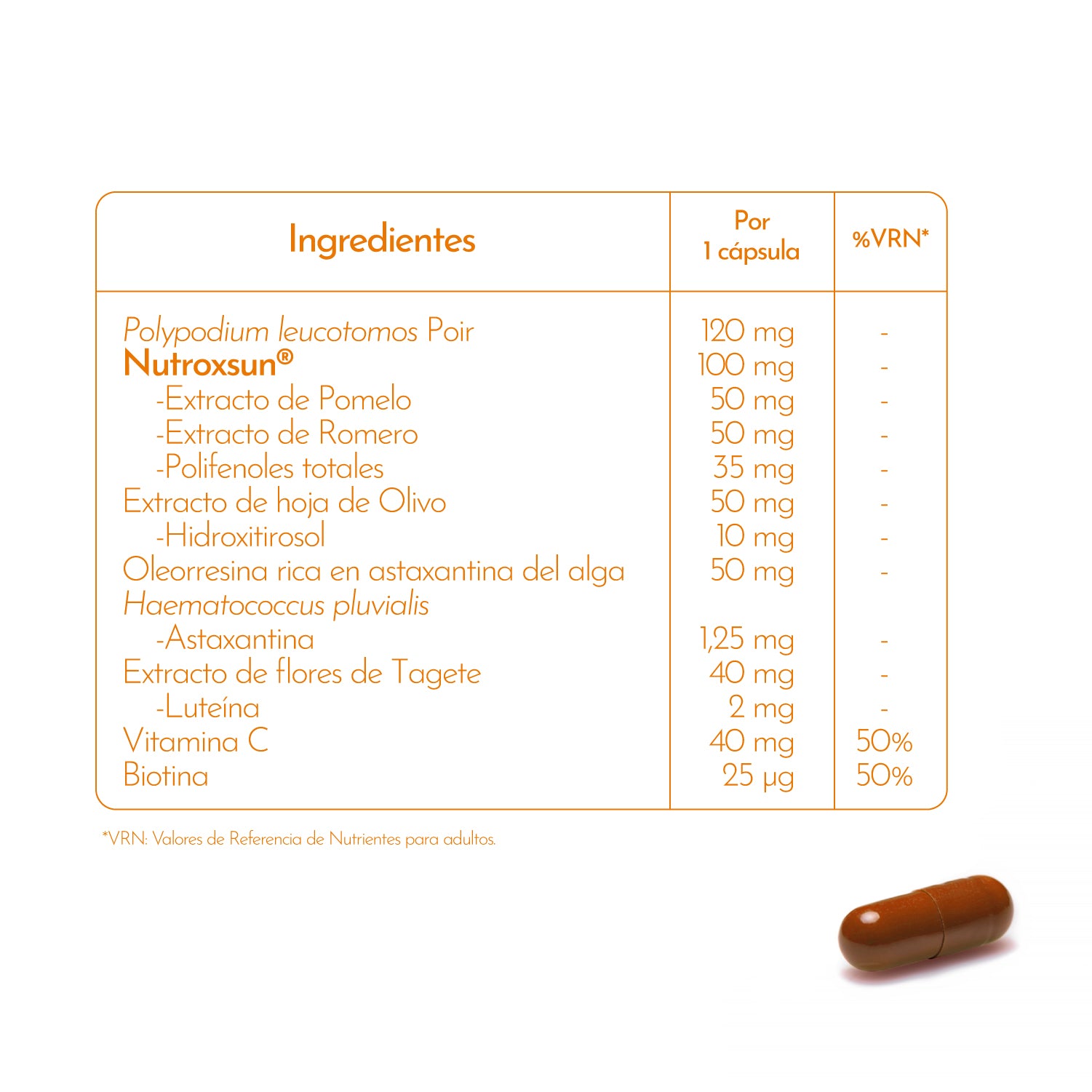 Dry extract of polypodium root (Polypodium leucotomos Poir.); capsule [coating agent (hydroxypropyl methylcellulose) colorant (iron oxides)];Patent for dry extract of grapefruit fruit (Citrus paradisi Macfad.), dry extract of rosemary leaves (Rosmarinus officinalis L.) and dry extract of olive leaf (Olea europaea L.);Patent for hydroxytyrosol and polyphenols; astaxanthin-rich oleoresin from the algae Haematococcus pluvialis; dry extract of tagete flowers (Tagetes erecta L.) ;5% lutein; vitamin C (L-ascorbic acid); bulking agent (microcrystalline cellulose); anti-caking agents (silicon dioxide, magnesium salts of fatty acids); biotin (D-biotin).