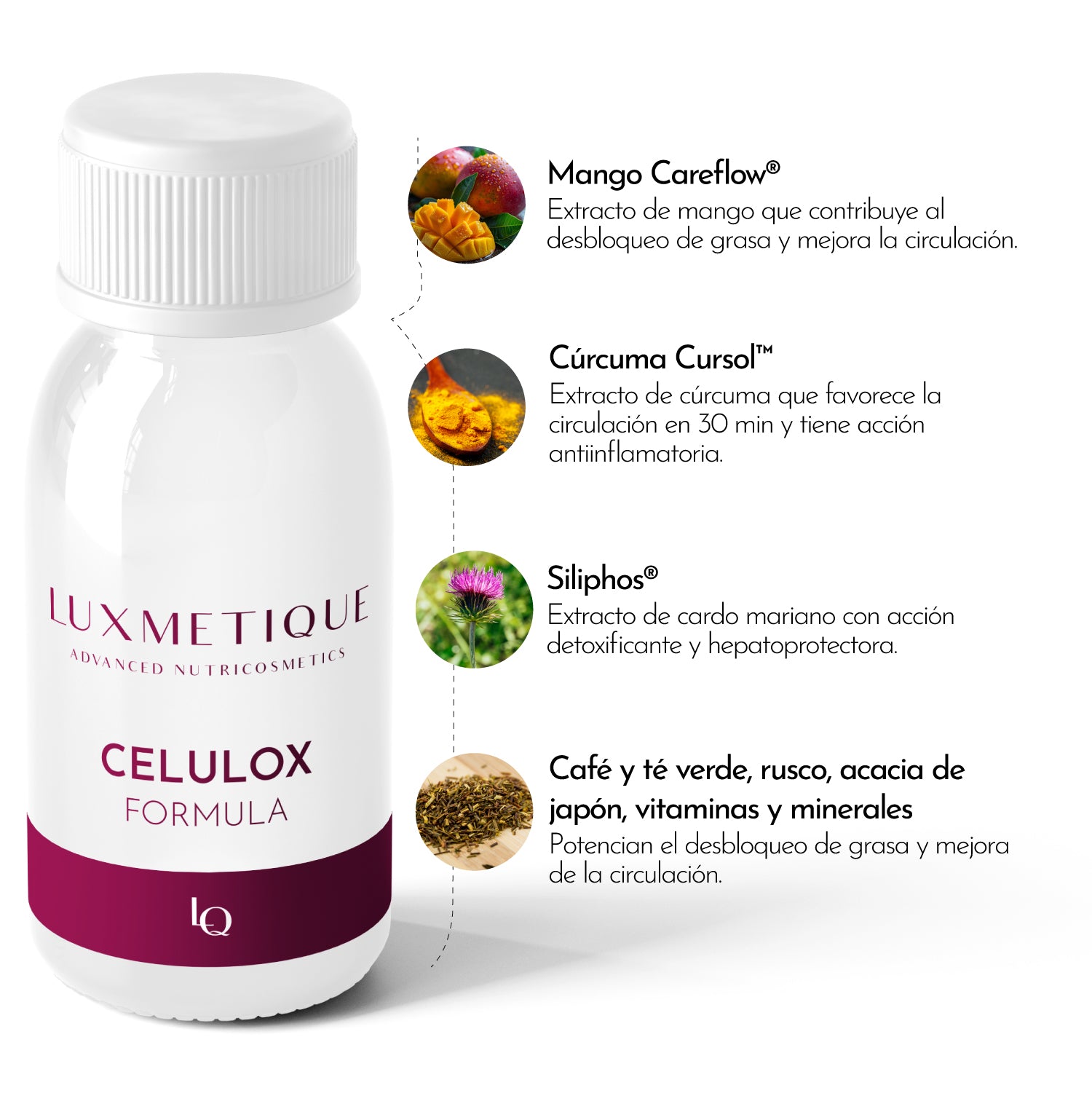Extracto seco de hoja de té verde(Camellia sinensis (L.) Kuntze), extracto seco de semilla de café verde(Coffea arabica L.); agua; emulgente(glicerina); polvo de fruto de mango patentado (Mangifera indica L.); goma guar(Cyamopsis tetragonoloba (L.) Taub.); cúrcuma patentada (extracto seco de rizoma de Curcuma longa L.), extracto de botones florales de acacia del Japón (Sophora japonica L.); silibina patentada (de extracto de fruto de cardo mariano (Sylibum marianum (L.) Gaertn.) con fosfolípidos (lecitina de soja); zumo concentrado de naranja liofilizado(Citrus sinensis (L.) Osbeck); aroma natural de cítricos; corrector de acidez (ácido cítrico), extracto seco de raíz de rusco(Ruscus aculeatus L. ); ácido L-ascórbico; aroma; conservadores (sorbato potásico y benzoato sódico); edulcorante (sucralosa); citrato de manganeso; metilcobalamina; clorhidrato de piridoxina; picolinato de cromo.