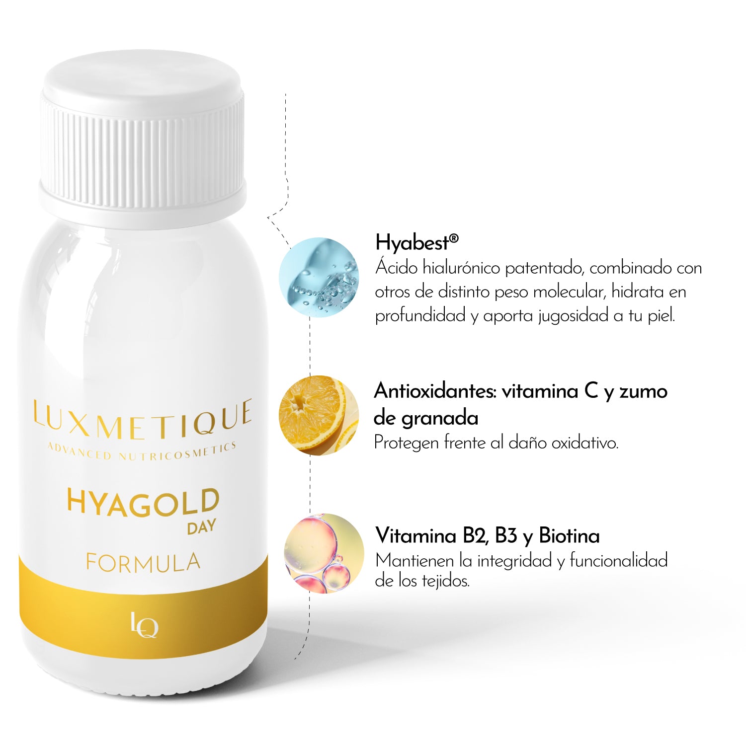 Ácido hialurónico de diferentes pesos moleculares, hialuronato sódico patentado (95% ácido hialurónico);agua; zumo concentrado deshidratado de fruto de granada (Punica granatum L.);ácido L-ascórbico (vitamina C); aroma; corrector de acidez (ácido cítrico anhidro); conservadores (benzoato sódico y sorbato potásico); nicotinamida (niacina); edulcorante (sucralosa); colorante (carotenos); riboflavina;D-biotina.
