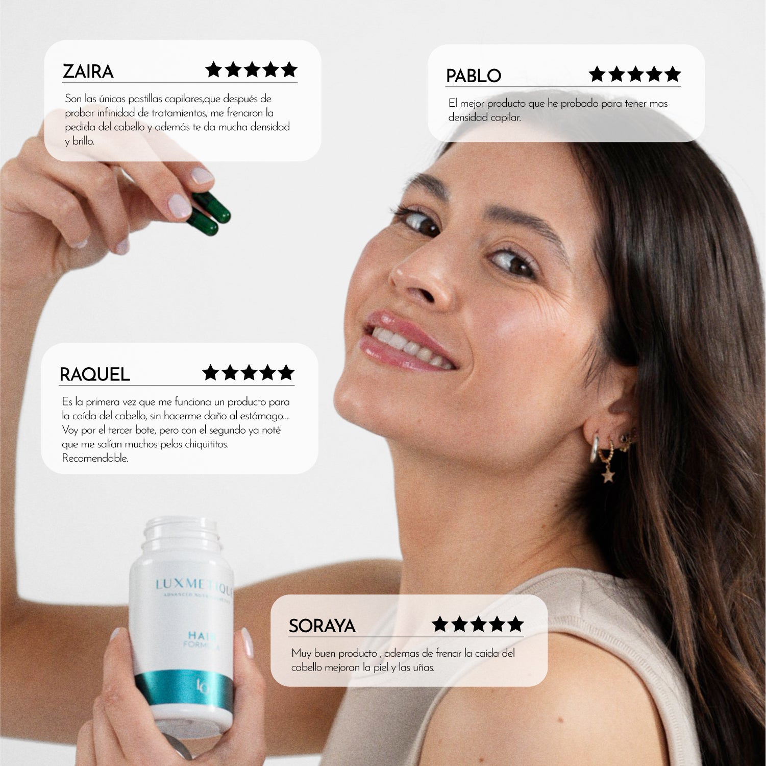 • Se recomienda tomar durante 3 meses consecutivos, a aquellas personas que tengan caída estacional, rotura, cabello quebradizo o quieran un pelo más largo y saludable, en poco tiempo.