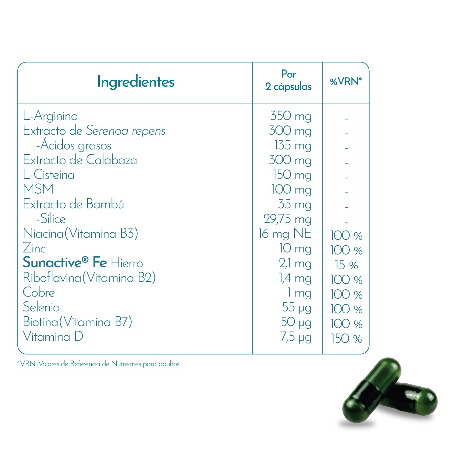 L-arginina; extracto seco de fruto de sabal (Serenoa repens (W.Bartram) Small) 45 % ácidos grasos; extracto seco de semillas de calabaza (Cucurbita pepo L.; cápsula [agente de recubrimiento (hidroxipropilmetilcelulosa);colorante (complejos cúpricos de clorofilinas)]; clorhidrato de L-cisteína; metilsulfonilmetano (MSM); extracto seco de tallo de bambú (Bambusa vulgaris Schrad.) 85 % sílice; citrato de zinc; patente de hierro de máxima biodisponibilidad y absorción; agente de carga (celulosa microcristalina); nicotinamida; antiaglomerantes (dióxido de silicio, sales magnésicas de ácidos grasos); colecalciferol; citrato cúprico; riboflavina; selenito de sodio; Vitamina D y Biotina.