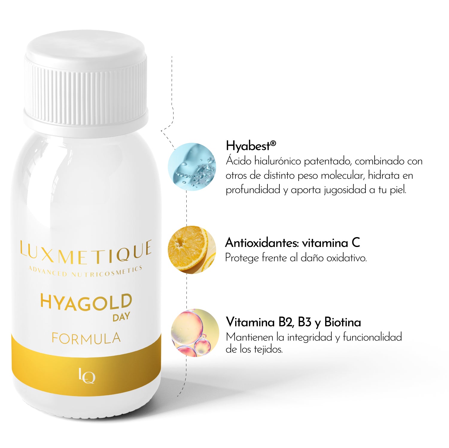 Ácido hialurónico de diferentes pesos moleculares, hialuronato sódico patentado (95% ácido hialurónico);agua; zumo concentrado deshidratado de fruto de granada (Punica granatum L.);ácido L-ascórbico (vitamina C); aroma; corrector de acidez (ácido cítrico anhidro); conservadores (benzoato sódico y sorbato potásico); nicotinamida (niacina); edulcorante (sucralosa); colorante (carotenos); riboflavina;D-biotina.